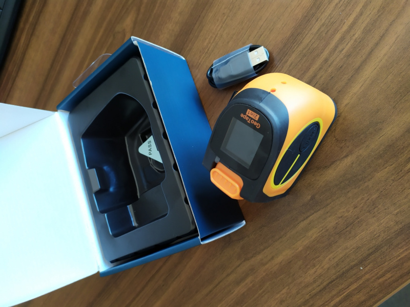 GeoTape20 se prodává v úhledné kartonové krabičce, na jejíž zadní straně najdete technické údaje. Dodávka obsahuje vlastní přístroj, zabudovaný moderní Li-Ion akumulátor 3.7V, USB nabíjecí kabel a návod k obsluze v čj.