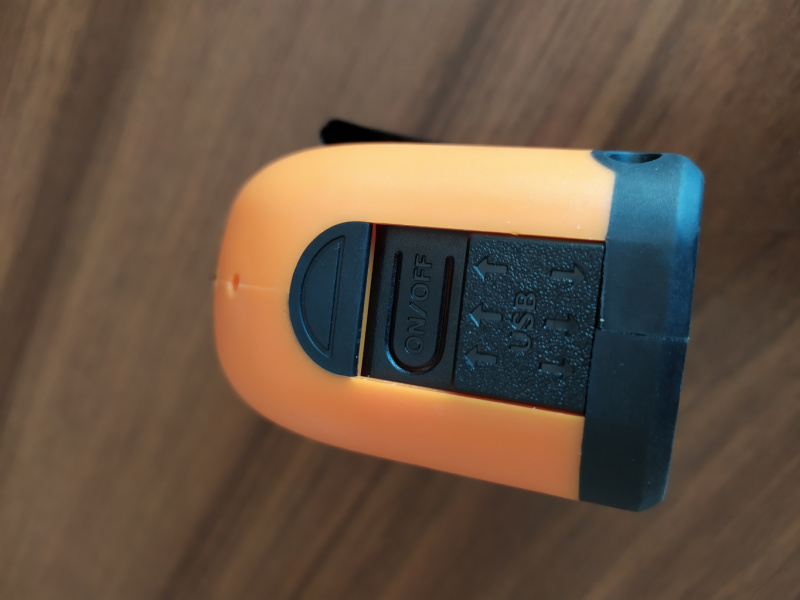 Při přepnutí přepínače do horní polohy se objeví zdířka (micro USB) pro nabíjení zabudovaného akumulátoru pomocí USB kabelu jak ze zásuvky 220V, tak také z USB portu v autě nebo z PC v kanceláři. Plně nabitý akumulátor vydrží cca. 5 hodin provozu. Konečně zbylá druhá boční strana má zabudovaný kovový klips pro připevnění např. na opasek apod. Rozměry GeoTape20 jsou 83 x 79 x 56 mm, jeho hmotnost je přijatelných 275 gramů a lze s ním měřit v teplotním rozpětí 0 až +40°C.