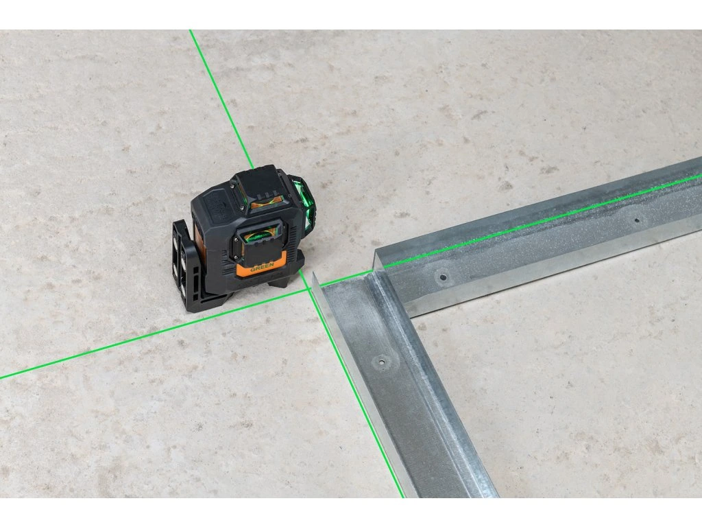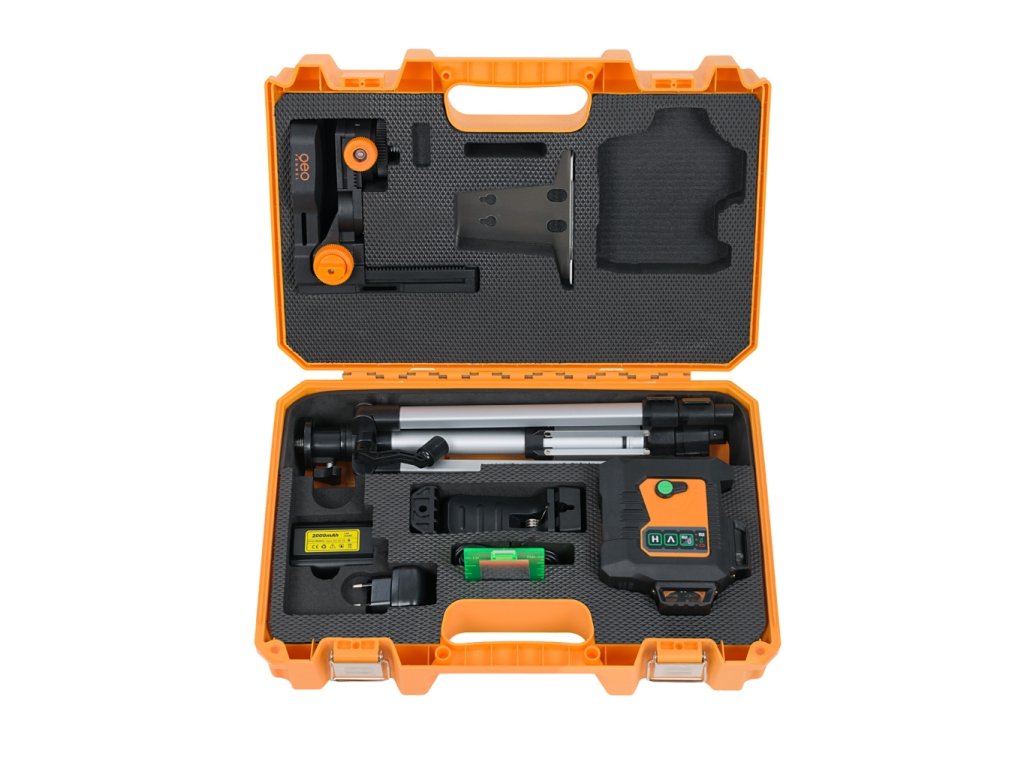 FLG 6X-Green MAXI SET sestává z liniového laseru se zeleným paprskem, Li-Ion aku, lehkého klikového stativu a dvou multifunkčních držáků