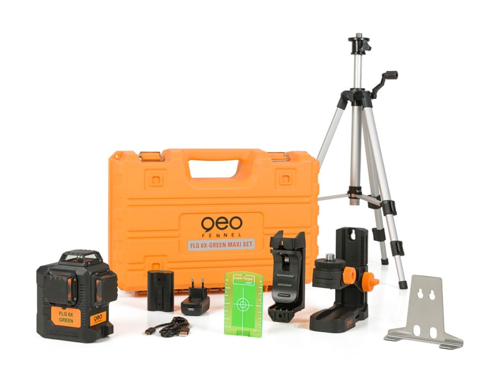 GeoFennel FLG 6X-Green MAXI SET sestává z liniového laseru se zeleným paprskem, Li-Ion aku, lehkého klikového stativu a dvou multifunkčních držáků