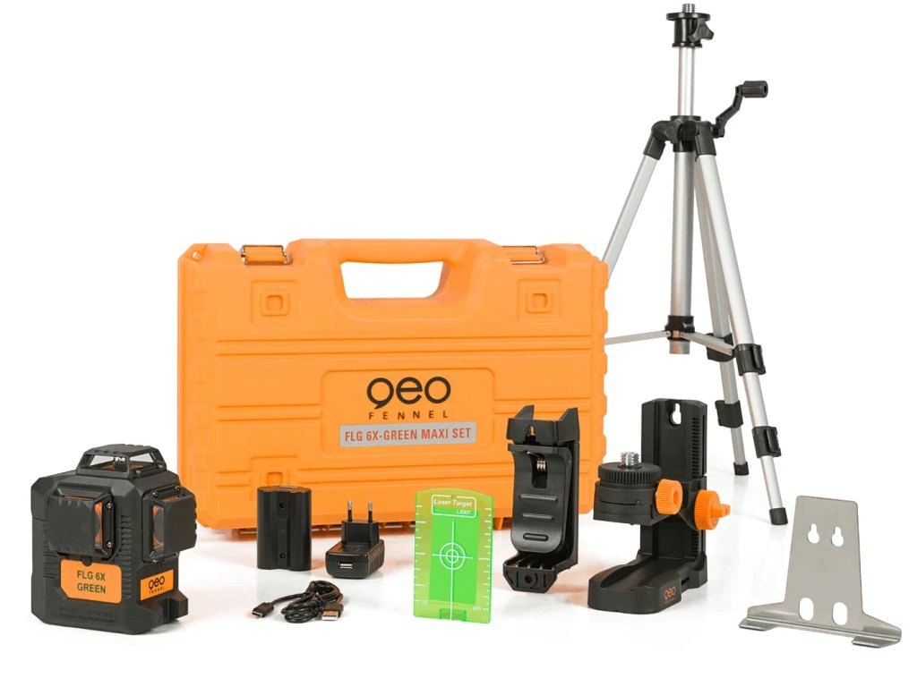 FLG 6X-Green MAXI SET se skládá ze samourovnávacího liniového laseru FLG 6X-Green se zeleným paprskem, lehkého hliníkového klikového stativu (min./max.=36/75 cm), multifunčního držáku MH1, držáku na kovové profily WS1 a kovové platformy, a to vše je uloženo v plastovém transportním kufru.