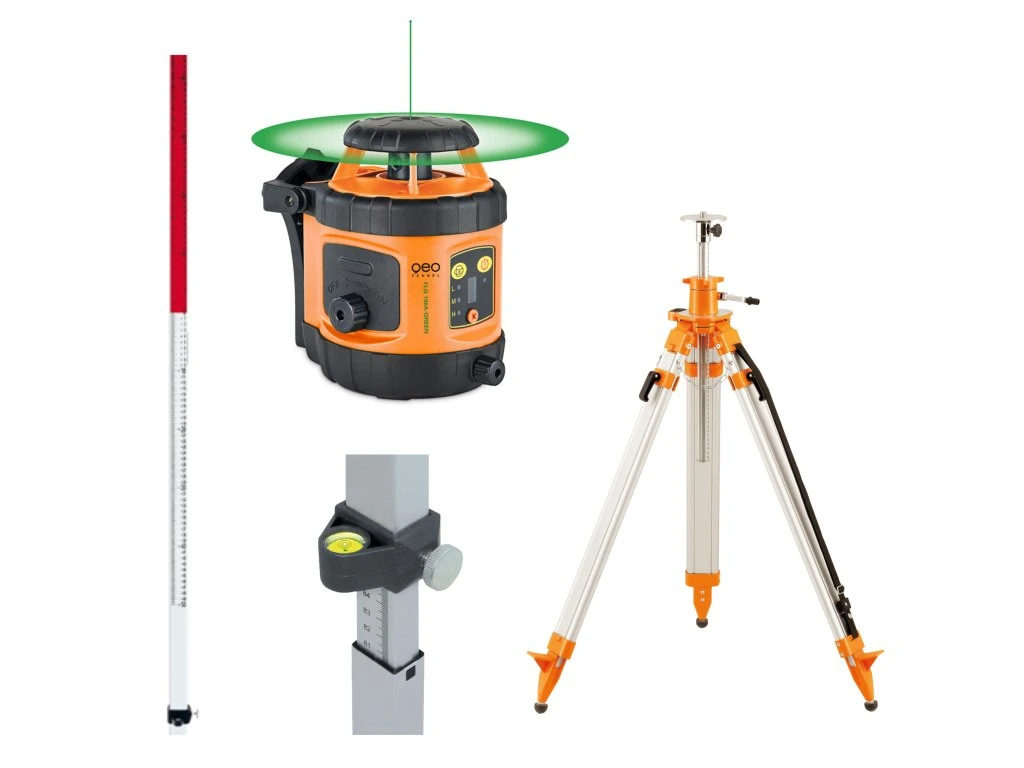 FLG 190A-Green je rotační laser se zeleným paprskem určený pro použití venku i uvnitř budov. Dosah s přijímačem FR 45, který je již v sadě obsažen, je 150m a s rotačním laserem pak lze pracovat i venku. Lze s ním vytyčovat vodorovnou i svislou rovinu.