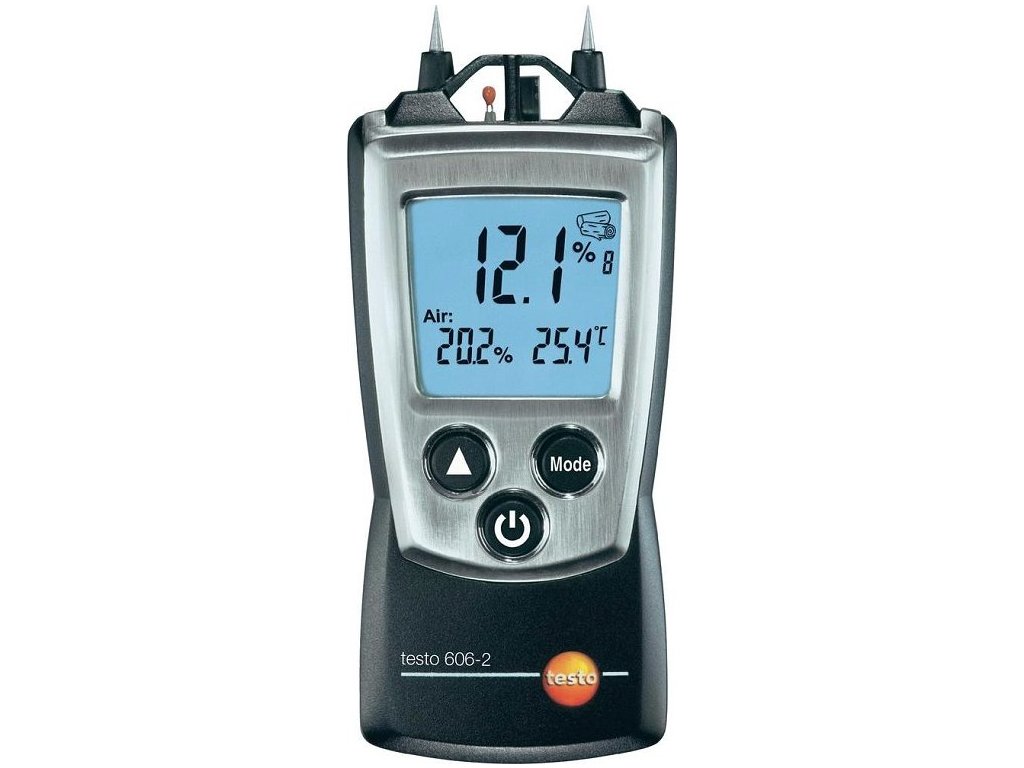 Testo 606-2 pomocí vpichu dvěma elektrodami spolehlivě snímá vlhkost dřeva a stavebních materiálů. Pomocí křivek materiálů může přístroj zobrazovat vlhkost materiálů přímo v hmotnostních procentech vztažených na sušinu (hmotnost sušiny).